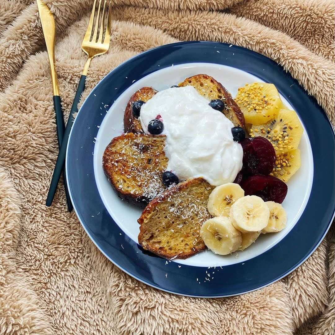 - できたフレンチトーストにヨーグルト、お好みでハチミツをかけて完成。