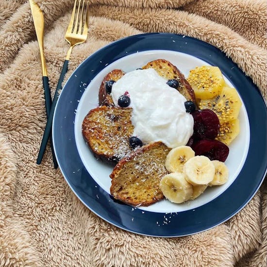 2. できたフレンチトーストにヨーグルト、お好みでハチミツをかけて完成。